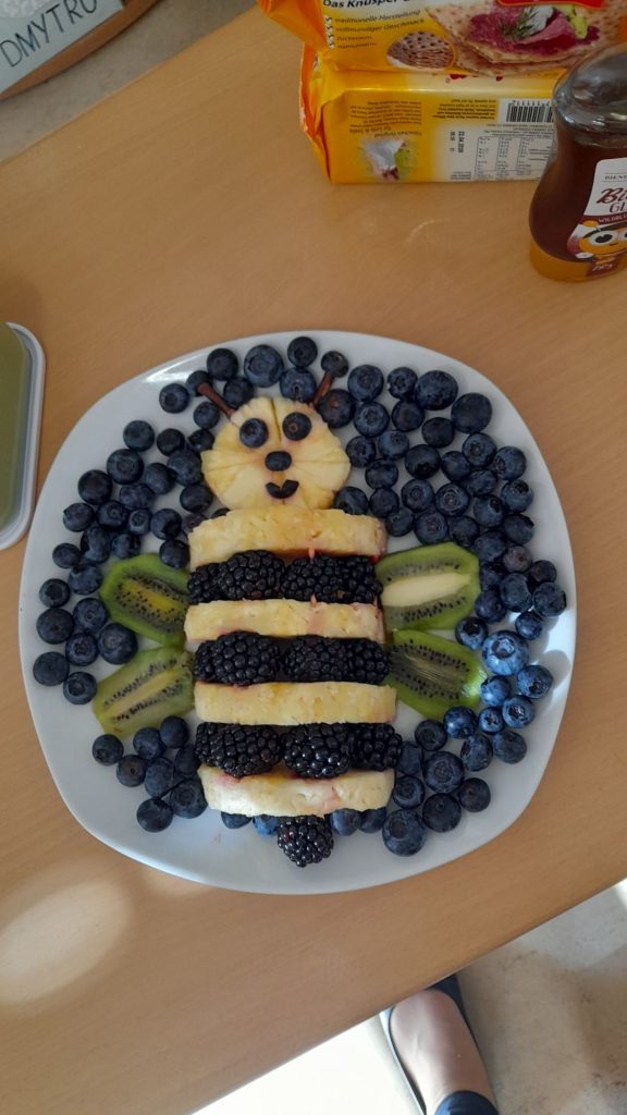 Wir hatten insgesamt vier Stationen, an denen wir gearbeitet haben. Zuerst mussten wir die Äpfel waschen. Das war wichtig, damit sie sauber sind. Danach haben wir die Äpfel geviertelt und alle schlechten Stellen entfernt. Es war lustig, die Äpfel so zu schnippeln!