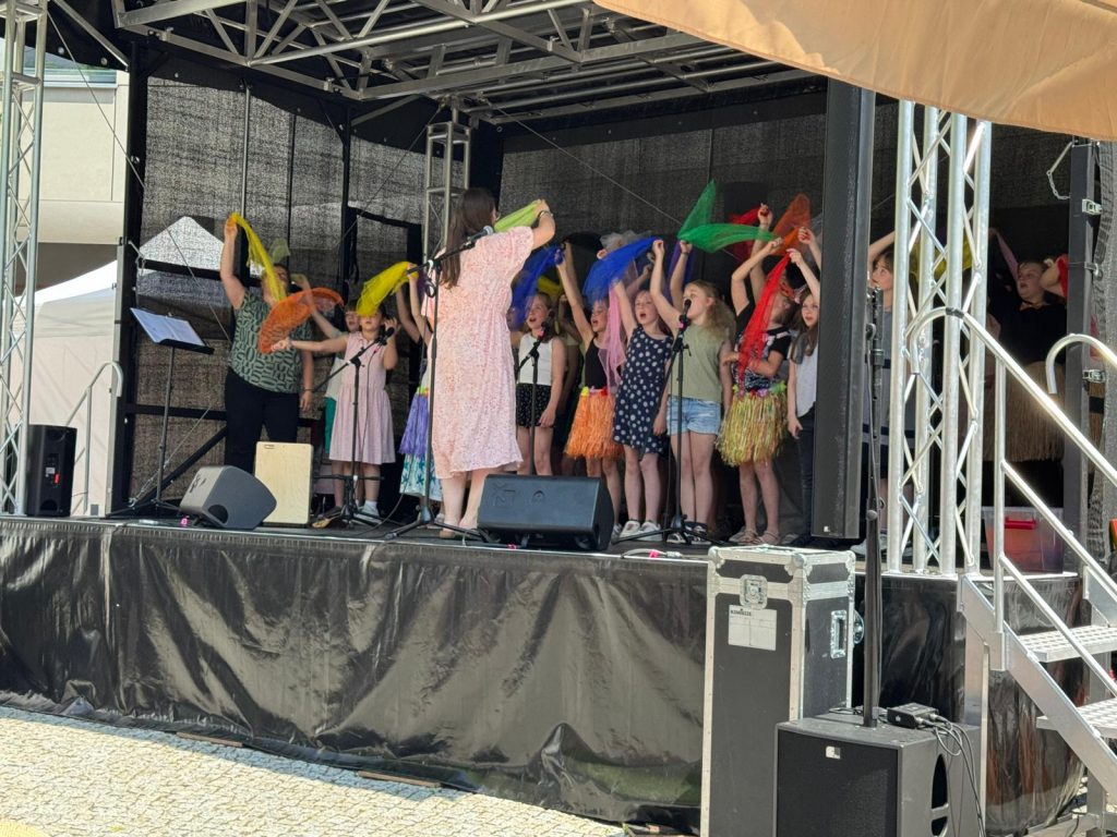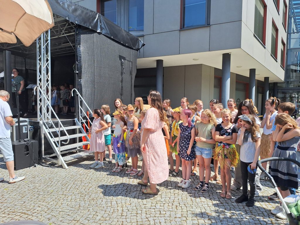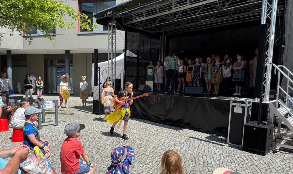 Unter der Leitung von Frau Weiler und Frau Giersch präsentierten die Kinder des „Schneckenchors“ (Jahrgänge 1–2) sowie des großen Schulchores (Jahrgänge 3–6) ein buntes, sommerliches Repertoire. Mit fröhlichen Liedern, Bewegungen und viel Herz verzauberten sie das Publikum auf dem Marktplatz. Die Plätze vor der Bühne waren voll besetzt und viele Besucher blieben spontan stehen, um zuzuhören und mitzuklatschen.