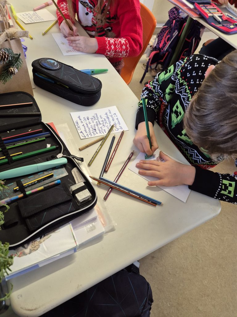 Wir machten uns eifrig ans Werk! Zuerst designeten wir weihnachtliche Karten im Kunstunterricht. Die Schülerinnen und Schüler ließen ihrer Kreativität freien Lauf und gestalteten bunte, festliche Motive. Im Deutschunterricht konzentrierten wir uns auf das Format der „Postkarte“. Dabei sammelten wir gemeinsam herzliche Ideen für weihnachtliche Grüße, die von Herzen kommen. Der Schreibschriftlehrgang wurde ebenfalls erfolgreich abgeschlossen, sodass jedes Kind stolz seine Postkarte in schöner Schreibschrift verfasste.