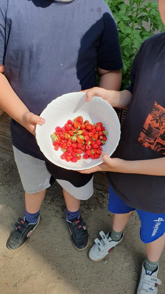 Besonders stolz war die Klasse 2b: Die Kinder durften frische Himbeeren und Erdbeeren pflücken und natürlich gleich in der Klasse kosten, naschen und genießen. So schmeckt der Sommer!